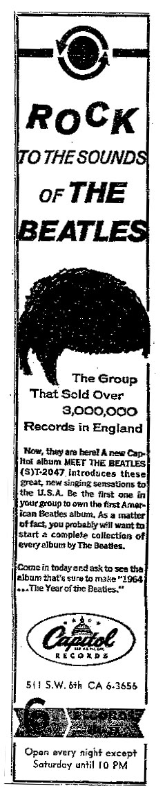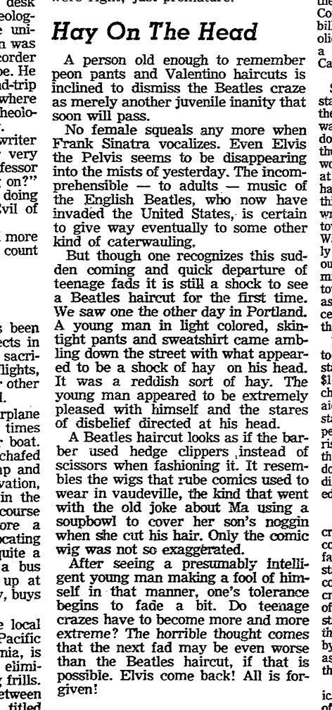 "The Beatles will make three appearances on the Ed Sullivan show Feb. 9, 16, and 23. Portland parents have been assuring their children that The Beatles are not the sons of Captain Kangaroo, even though their hair cuts are the same. One barber in Raleigh Hills, tired of giving Beatle haircuts to kids, advised them to go next door to a beauty parlor. One of our colleagues says that the break-off point in Beatle appreciation is 12 years of age. Eight graders look down their sophisticated noses at 7th graders who are still wild about the British vocal and instrumental quartet. KISN is the local Beatle station."