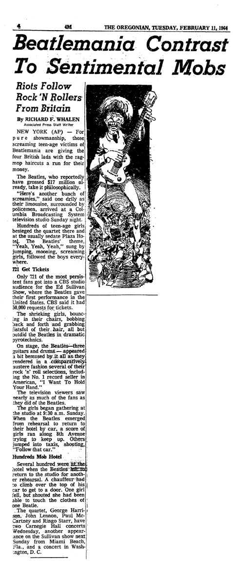 Follow these links to original pages from the Oregonian from Februray of 1964. It's fun to read the perspectives by adults who could not believe the Fab Four would last out the month.